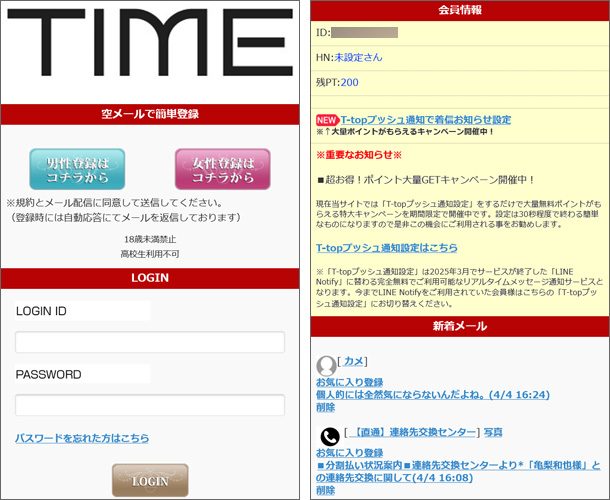TIME/タイム(黒木ノア・八神ゆう)インチキ出会い系を暴く! 更新日:2026年4月4日 公開日:2017年5月1日 芸能人なりすまし詐欺 TIME/タイム 概要 新 TIME(タイム) https://gold.p2-time.com/ [email protected] ※左ログイン前・右ログイン後 旧 ★HART★(ハート) https://o […] 続きを読む
