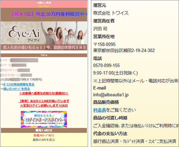 Eye-Ai/アイアイ(株式会社トワイス)[email protected] 更新日:2026年3月9日 公開日:2013年1月8日 ポイント制サイト Eye Ai/アイアイ 概要 ※サクラ率100%の悪徳出会い系です! https://pc.aibeautia1.jp/ https://www.aibeautia1.jp/ [email protected] 【1】 […] 続きを読む