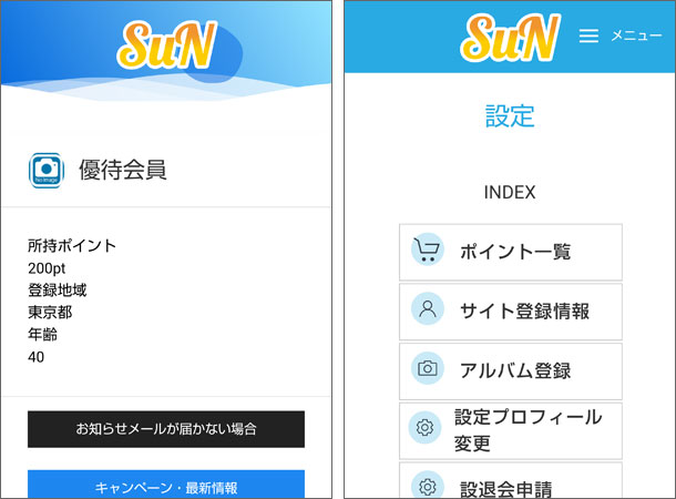 SuN(サン)とは、芸能人御用達のマッチングサイトです。迷惑メールの配信停止と退会方法については、SuN運営事務局まで。ようこそ、優待会員さん。芸能人とコンタクトを取れると口コミや評判を頂いてます。電話番号を送る場合には、事前に電話番号の登録が必要です。電話番号をお問い合わせまで申請して下さい。華やかで非日常な出会いが、ここから始まります。あなたのSuNでの物語が、静かに動き出します。