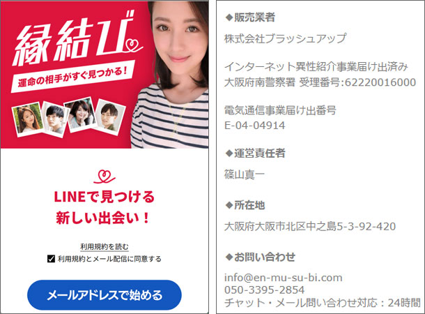 縁結び(えんむすび)は、株式会社ブラッシュアップ(株式会社BRUSHUP)が運営する出会い系サイトです。退会希望は縁結び運営事務局まで。チャットアプリ利用満足度1位。縁結びアプリは会員数30万人突破。笑顔の口コミや良い評価も多数届いています。連絡先交換や送受信が全て無料。運命の相手がすぐに見つかると評判です。えんむすびドットコム。LINEで見つける新しい出会い。メールアドレスでも始められます。