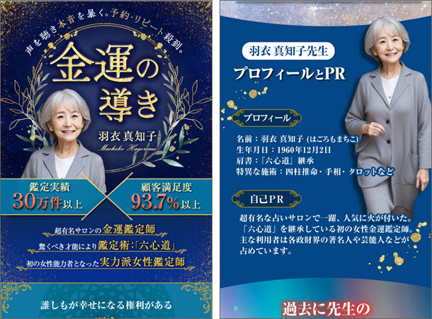 実力派金運鑑定師の羽衣 真知子(羽衣 まちこ・はごろも まちこ)先生。生年月日1960年12月2日。肩書「六心道」継承者。超有名サロンの金運鑑定師。声を聴き本音を暴く。予約リピート殺到。顧客には芸能人や政治家が多数。顧客満足度93.7%。鑑定実績30万件以上。